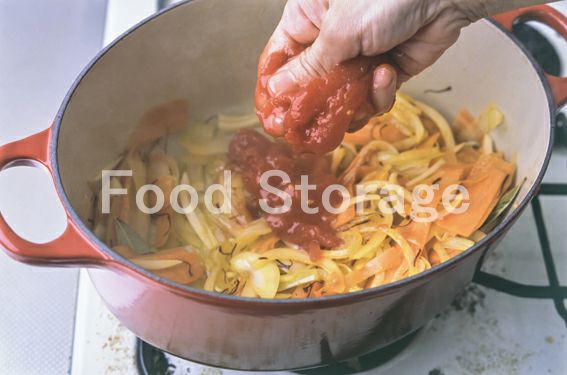 鍋にオリーブ油を入れて火にかけ、2の野菜を入れてしんなりするまで炒める。途中で3のサフランとローリエも加える。 |