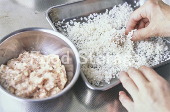 3のタネの2/3をシューマイの皮で包む。残りは銀杏を入れて丸め、水気をきった1のもち米をまぶす。 |