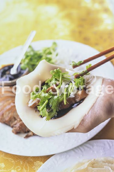 2と白髪ねぎ、香菜のざく切り、甜麺醤を大皿などに盛って、各自好みで皮に包んでいただく。 |