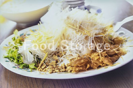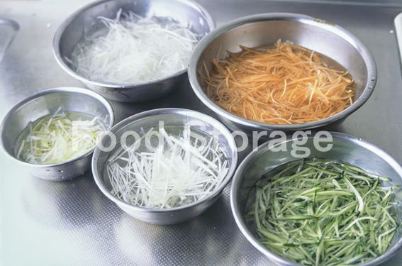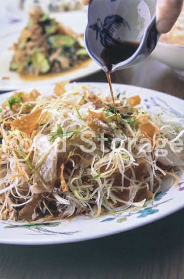 Aはごく細いせん切りにし、それぞれ冷水にさらしてパリッとさせ水気をしっかりときっておく。香菜はざく切りにする。 |