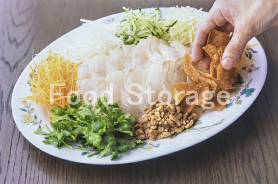 ピーナツは低温の揚げ油で揚げて粗みじんに切る。ワンタンは中温の揚げ油できつね色に揚げ、砕く。 |
