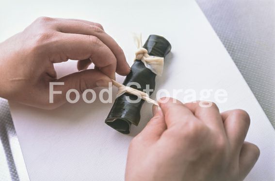 1の昆布をまな板に縦に置き、手前に身欠きにしんをのせてから巻き込む。かんぴょうで2箇所をゆるめにしばって留める。 |