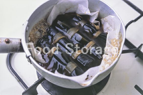 鍋にクッキングシートを敷き、2の結び目を下にして1の戻し汁と酒を加えて落とし蓋をし、弱火で30分程煮る。Aを加えて30分程煮、しょうゆを加えて煮汁が1/3になるまでさらに煮る。 |