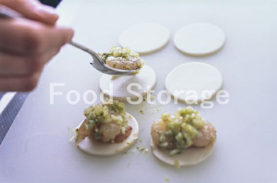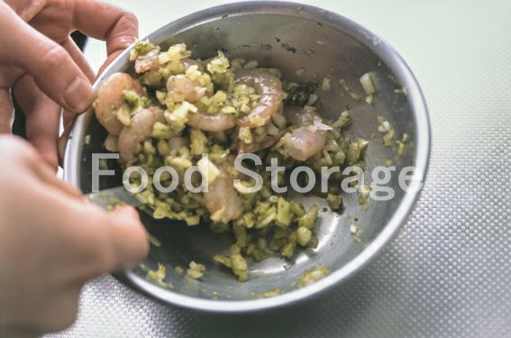 むきえびは背ワタを取り除き、塩、こしょうをふる。玉ねぎはみじん切りにする。