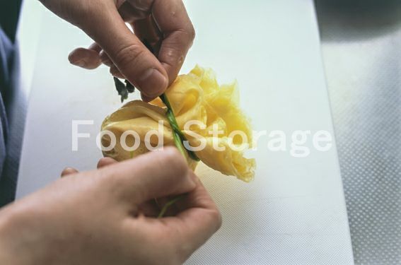 4、5をそれぞれ1の薄焼き卵で包み、三つ葉で結んで留める。 |
