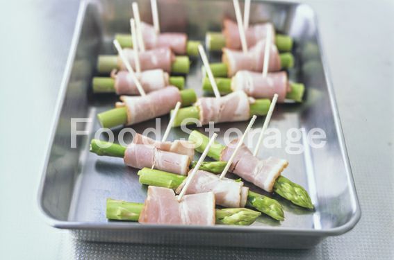 アスパラガスは根元のかたい部分を切り落とし、半分に切る。ベーコンは半分に切ってアスパラに巻きつけ爪楊枝で留める。