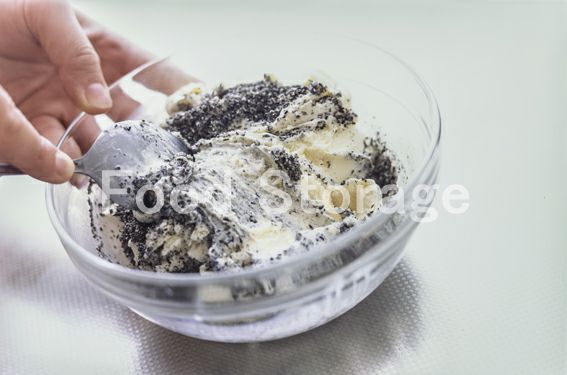 1に黒すりごまを加えて混ぜ合わせ、再び冷凍庫で冷やし固める。