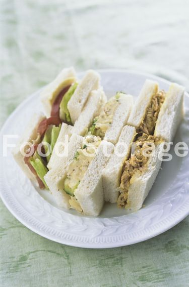 1 食パンは耳を切り落とし、室温に戻したバターを塗る。 2 Aのツナは汁気をきり、他の材料と混ぜ合わせ、1ではさむ。ポテトサラダも同様に1ではさむ。 3 Bのレタスは食べやすい大きさにちぎり、トマトは薄切りにし、スライスチーズを重ねて1ではさむ。 4 2、3はそれぞれ4等分に切って器に盛る。 |