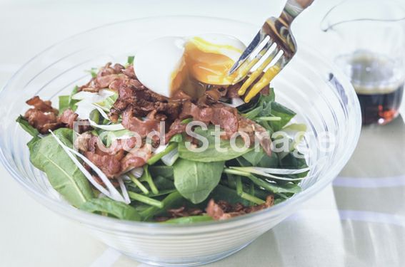 1 サラダほうれん草はざく切りにし、長ねぎは斜め薄切りにして混ぜ合わせる。 2 ベーコンは1cm幅に切り、サラダ油を熱したフライパンで炒め、取り出しておく。 3 2の残った油にAを加えてドレッシングを作る。 4 卵は水をはった鍋で10分ゆでて半熟卵を作り、殻をむく。 5 器に1、2、4の順に盛り、3をかけていただく。 |
