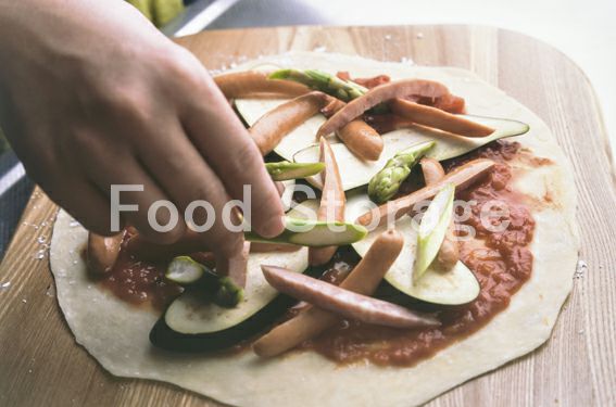 1 ピーマンは輪切りにし、なすは薄切りに、アスパラガスは斜め薄切りに、ソーセージは縦4等分に切る。 2 ピザ生地に粉チーズをふってトマトソースを塗り、1をのせて200℃に熱したオーブンで10分〜12分焼く。 |