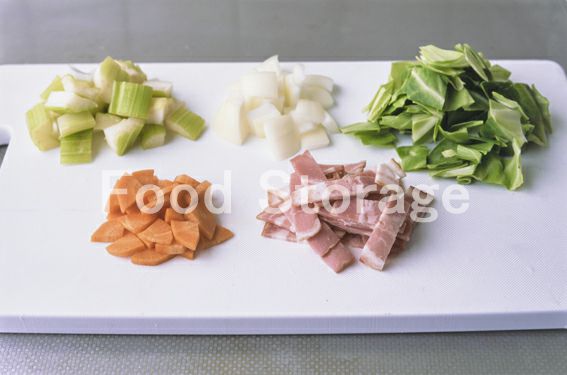 1 ベーコンは1cm幅に切る。キャベツ、セロリ、玉ねぎは1.5cm角に切り、にんじんはいちょう切りにする。 2 フライパンにサラダ油を熱し、1、汁気をきったコーンを炒め合わせ、Aを加えて10分程煮る。 3 2にBを加えて味を調える。 |