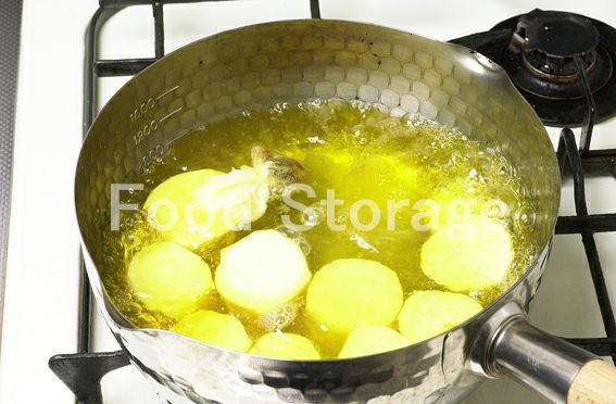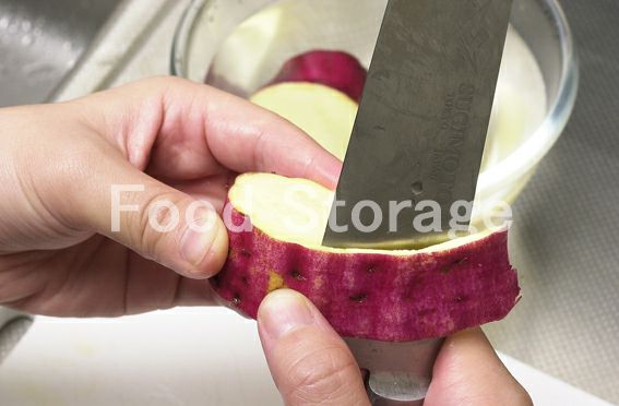 さつまいもは2cm厚さの輪切りにし、厚めに皮をむいて水にさらしてアクを抜き、ザルにあげて水気を切る。 |