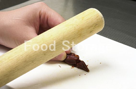 くちなしの実はめん棒などでたたいて割り、ガーゼに包む。 |