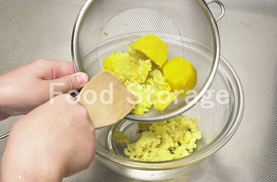 3のくちなしの実を取り除き、ザルにあげて水気を切り、さつまいもが温かいうちに裏ごし器でこす。 |