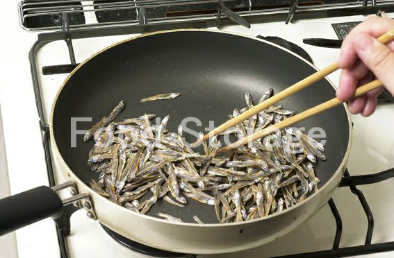 フライパンにごまめを入れ、弱火で焦がさないようにから炒りする。 |