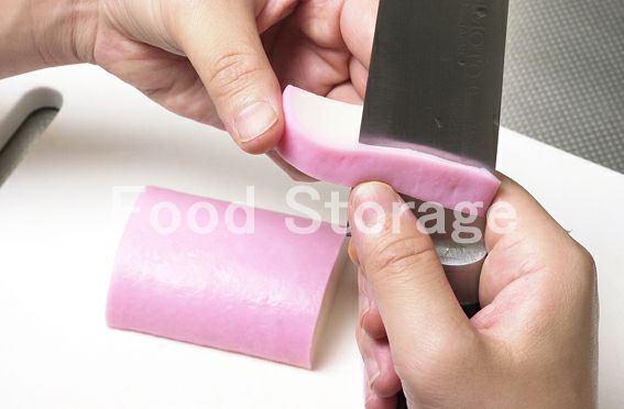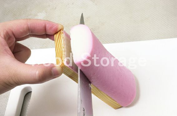 かまぼこは板に沿って包丁を入れて板からはずす。 |