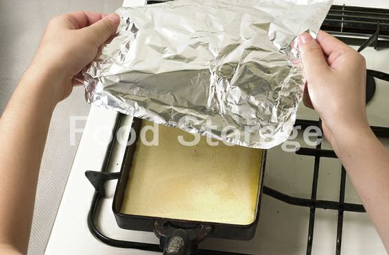 卵焼き用フライパンにサラダ油を薄く塗り、2を流し入れ、 アルミホイルをかぶせて弱火で焼く。 |
