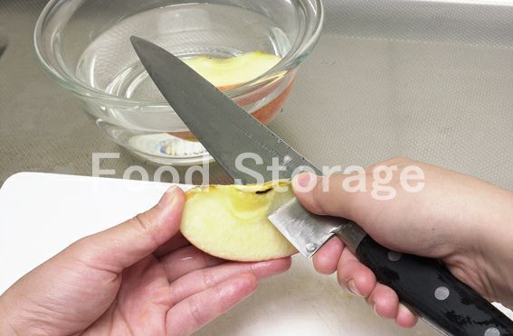 りんごは皮付きのままくし型に切って種の部分を切り落とし、塩水(分量外)に漬ける。 |