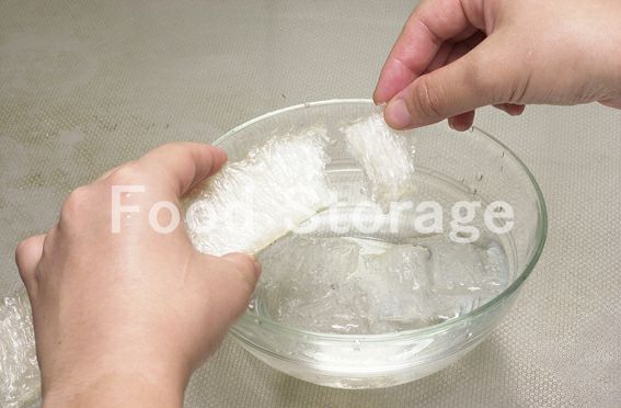 棒寒天は適当な大きさに手でちぎり、水(分量外)に浸してふやかす。 |
