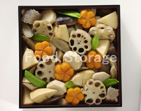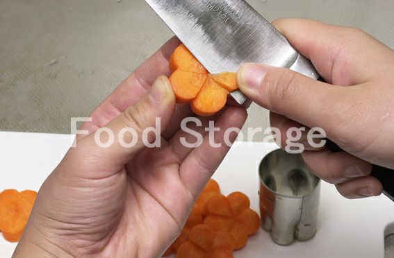 にんじんは1cm厚さの輪切りにしてから梅型で抜く。花びらと花びらの間から中央に向かって切り込みを入れ、花びらのまん中から切り込みに向かって斜めに包丁を入れて飾り切りにする。 |