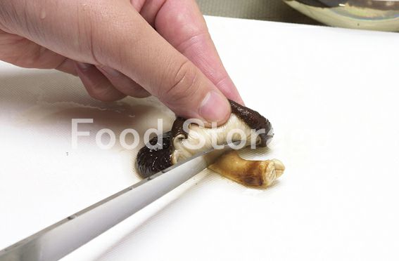 干ししいたけは水に浸して戻し、石づきを切り落とす。戻し汁はだし用にとっておく。 |