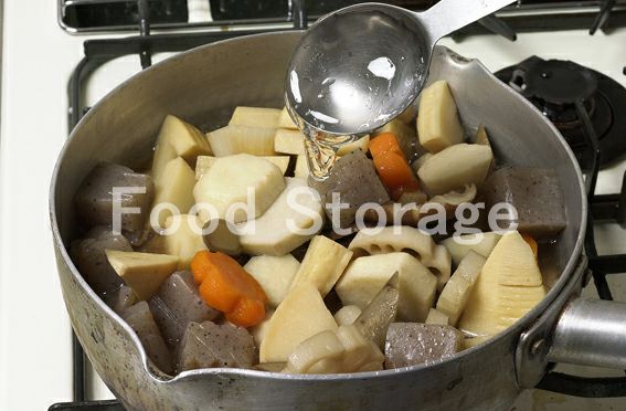 鍋の1の干ししいたけ、2、3、9を入れ、1の戻し汁、aを加えて落とし蓋をし、中火で20分ほど煮、煮汁が少なくなってきたら水あめを加えて火を止める。 |