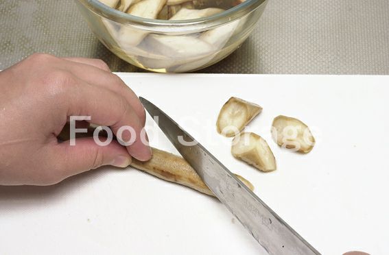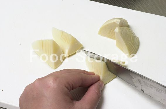 たけのこ水煮は根元の方は1cm厚さのいちょう切り、穂先の方はくし型に切る。 |