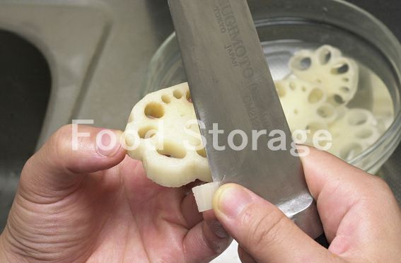 れんこんは皮をむいてから8mm厚さに切り、穴と穴の間にV字の切り込みを入れて切り取り、切り取った間を弧になるように丸く切って花形にする。 |