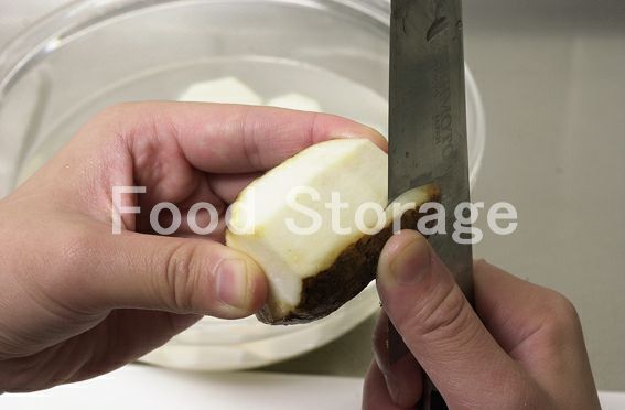 里いもは皮をむいてから1cm厚さの輪切りにする。 |