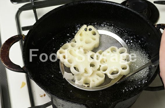 150℃に熱した揚げ油で4〜7をゆっくりと揚げてから油をきり、さっと湯通ししてザルにあげ、水気をきる。 |