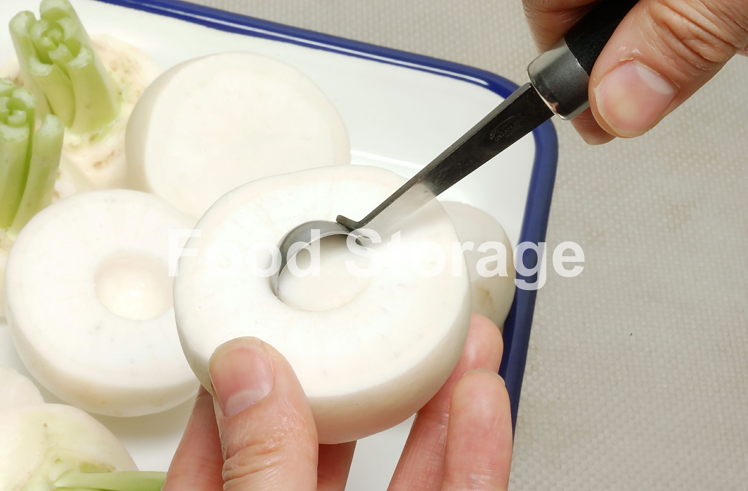 | 甘みの増したかぶをくり抜き、そのなかに風味豊かなゆずみそを詰めました。 |