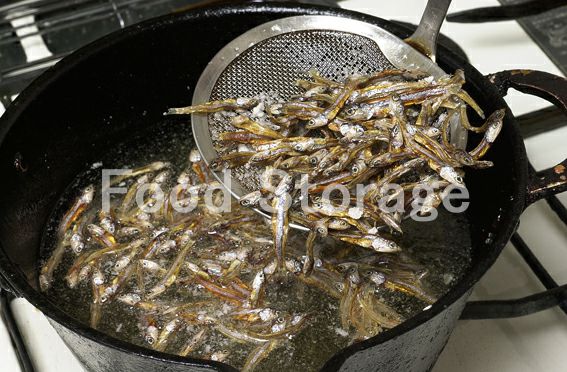 ごまめに片栗粉をまぶし、170℃に熱した揚げ油でカラっと揚げ、七味唐辛子をふる。 |