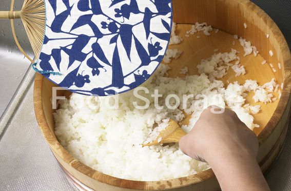 炊飯器に7、bを加えて炊く。炊き上がったら塗らした飯台に移して合わせたcを加え、うちわであおぎながらしゃもじで全体を切るようにして混ぜ合わせる。 |