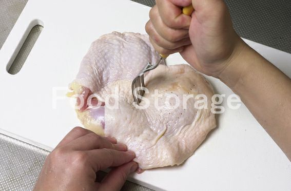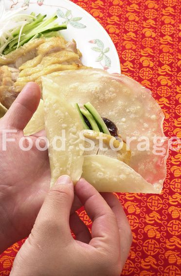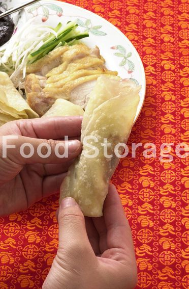 巻き方は、皮にたれを薄く塗り、きゅうり、長ねぎ、鶏肉をのせる。 |