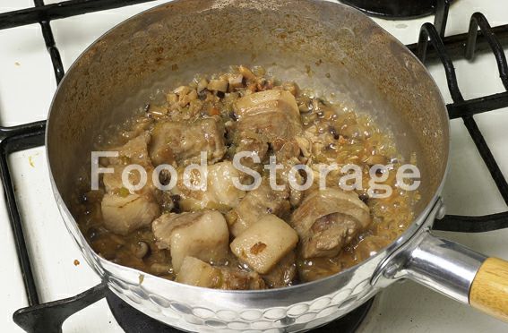 中華鍋にごま油を熱し、3、4の順に加えて炒め合わせてbを加え、煮汁が少なくなるまで煮詰める。(八角は取り出す。) |