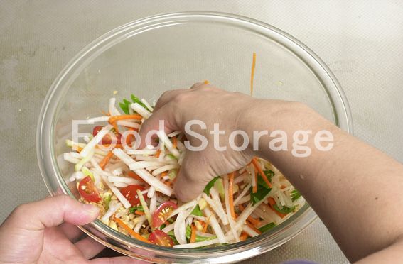 1 大根、にんじん、セロリは5cm長さの細切りにし、セロリの葉の部分はざく切り、プチトマトはヘタを取り除いて4等分に切る。 2 ピーナッツは粗めのみじん切りにし、干しえびはぬるま湯に浸して戻してから粗めのみじん切りにする。 3 にんにくはみじん切り、赤唐辛子は種を取り除いて小口切りにし、aを加えて混ぜ合わせる。 4 1、2に3を加え、手で揉みこむようにして混ぜ合わせる。 |