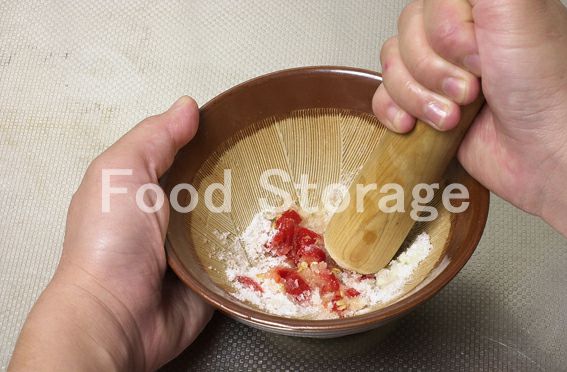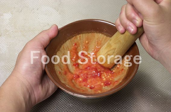 にんにく、赤唐辛子はみじん切りにしてすり鉢に入れ、砂糖を加えてすりつぶす。