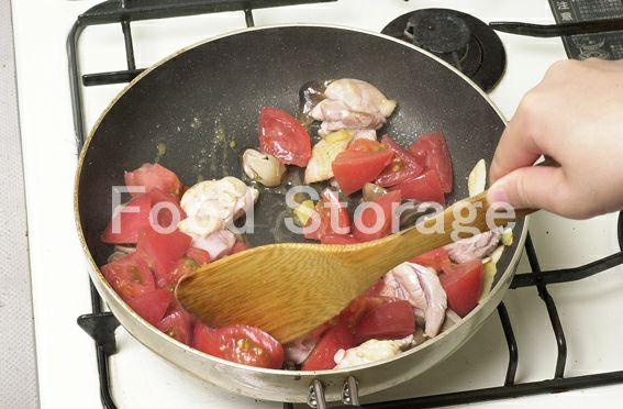 鶏もも肉、トマトはひと口大に切り、ふくろたけは半分に切る。 |