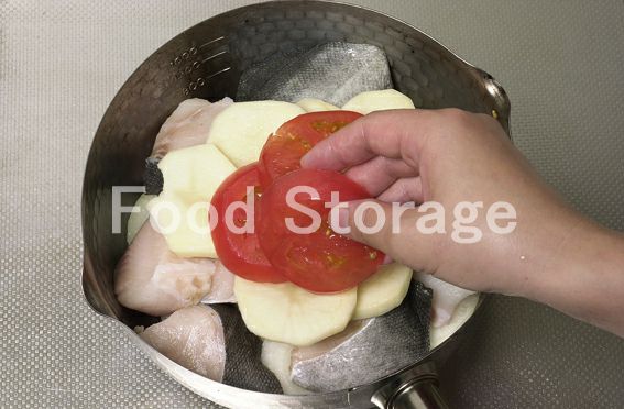1 銀だらは半分に切り、じゃがいもは皮をむいて5mm厚さの輪切り、玉ねぎ、トマトも5mm厚さの輪切りにする。 2 鍋に1を重ね入れ、aをふる。 3 2に白ワインを加え、蓋をして中火で15分ほど蒸す。 |