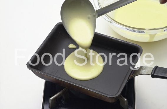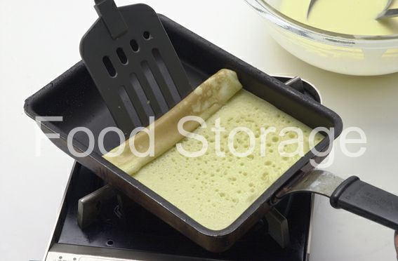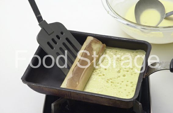 卵焼き用フライパンを火にかけて熱し、薄くサラダ油をひき、1を少量ずつ流し入れ、フライパンを動かして生地をのばす。