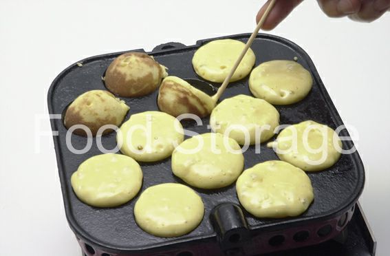 熱したタコ焼き器に薄くサラダ油をぬり、1を8分目まで流し入れて、生地がフツフツと泡立ってきたら、竹串や千枚どうしなどでひっくり返して形を整えながら焼く。串をさしてなにもついてこなければ、できあがり。 |