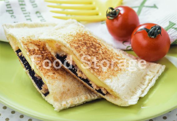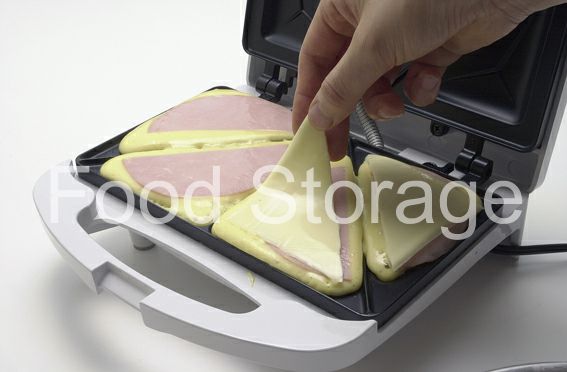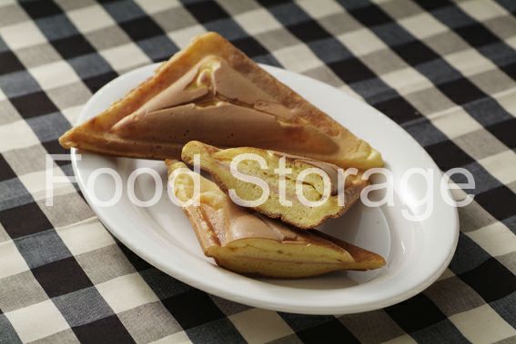 温めたホットサンドメーカーにサラダ油を薄くぬり、1の1/4量ずつを流し入れ、切ったハムとチーズ、1の1/4量の順にのせ、フタをして2〜3分焼く。