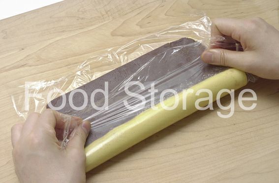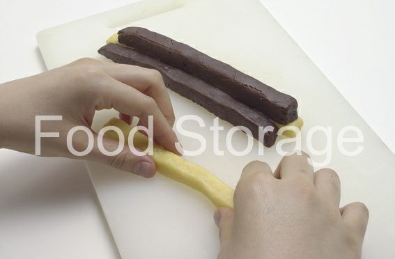もう半分で渦巻き形を作る。打ち粉(分量外)をした台で2色の生地ともに、だいたい20cm×15cmの大きさ(約2mm厚さ)にめん棒でのばし、ラップを敷いた上にプレーン生地、さらにその上にココア生地をのせてはしからのり巻きのように巻いていく。