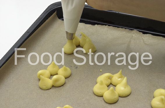 2の残りと3をそれぞれ直径1?の丸口金をつけた絞り出し袋に入れ、クッキングシートを敷いた天板に小さな丸を5つ絞って、花形を作る。