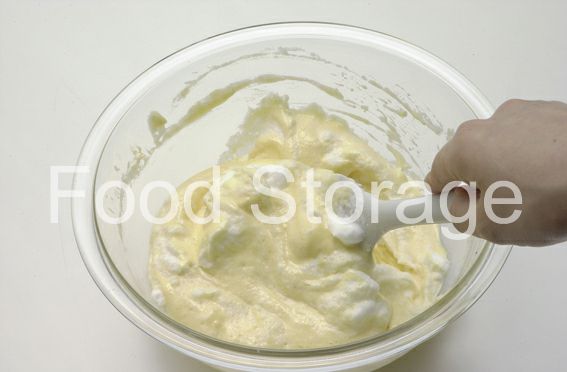 別のボウルに卵白を入れ、砂糖を少しずつ加えながら泡立て、しっかりとしたメレンゲを作り、2に加えてさっくりと混ぜ合わせる。