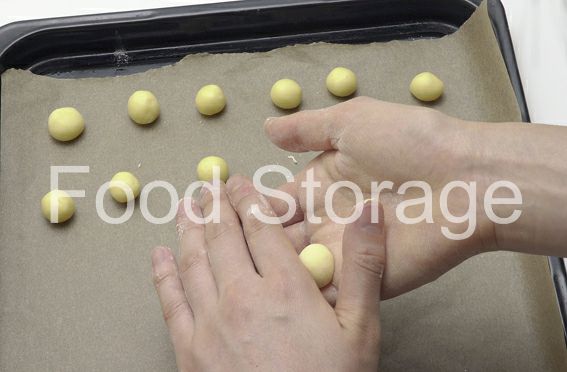 手に粉(分量外)をまぶし、3の生地を少量ずつとっては、約1cm程度の大きさに丸め、クッキングシートを敷いた天板にのせて、180℃に熱したオーブンで8分焼く。 |