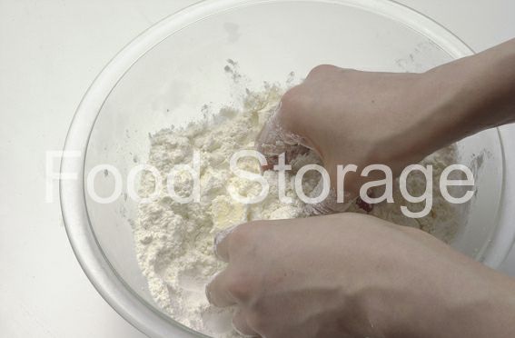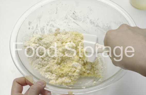 ボウルにホットケーキミックスと冷やしたバターを入れて、指でバターをつぶしながらすり混ぜる。