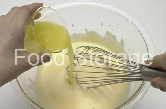 1にオレンジの絞り汁、溶かしバターを加えて混ぜ、さらにホットケーキミックスを加えて静かに混ぜ合わせる。