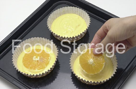 型に2を流し入れ、輪切りにしたオレンジをのせて170℃のオーブンで20分焼く。 |
