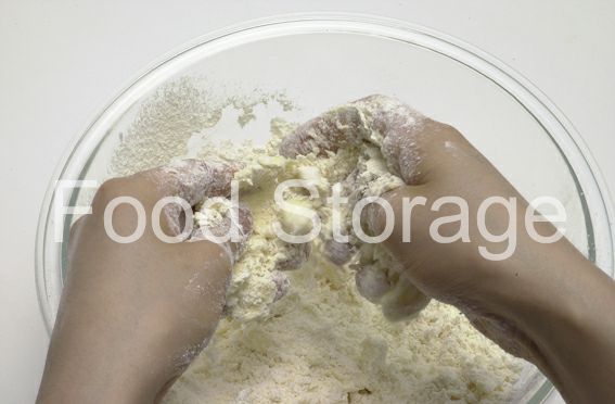 パイ生地を作る。ボウルに合わせてふるったA、冷やしておいたバターを入れ、バターを指でつぶしながらポロポロの状態になるまですり混ぜる。